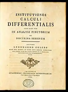 Institutiones calculi differentialis (Foundations of differential calculus) is a mathematical work written in 1748 by Leonhard Euler and published in 1755 that lays the groundwork for the differential calculus. It consists of a single volume containing two internal books; there are 9 chapters in book I, and 18 in book II.