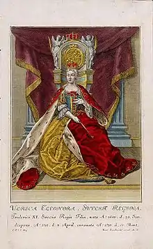 The Instrument came about as a result of the succession crisis which occurred after Charles XII of Sweden died childless during the Great Northern War, leaving two potential heirs: his sister Ulrika Eleonora the Younger, and his nephew Charles Frederick, Duke of Holstein-Gottorp.[1] The crisis was eventually resolved by a deal whereby the Riksdag acknowledged Ulrika as queen regnant, and in exchange she signed a new constitution, thereby renouncing the absolute monarchy instituted by her father King Charles XI.[2] As such it was in effect a revival of the Instrument of Government (1634), and indeed the title "Instrument of Government" (Swedish: regeringsform) was deliberately chosen to invoke that earlier document;[3] there are however substantial differences between the two, with the 1634 Instrument having a more narrowly descriptive and administrative function while the 1719 Instrument was explicitly intended to be a political constitution in the modern sense.[4]