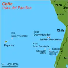 - The Juan Fernández Islands, composed of Robinson Crusoe, Alejandro Selkirk and Santa Clara islands, located 670 kilometres (420 miles) west of Valparaíso