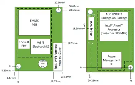 In March 2014, Intel announced changes in the Intel Edison project and the second version of the board was presented in September 2014. Its dimensions are 35.5 x 25 x 3.9 mm, with components on both sides. The board's main SoC is a 22 nm Intel Atom "Tangier" (Z34XX) that includes two Atom Silvermont cores running at 500 MHz and one Intel Quark core at 100 MHz (for executing RTOS ViperOS). The SoC has 1 GB RAM integrated on package. There is also 4 GB eMMC flash on board, Wi-Fi, Bluetooth 4 and USB controllers. The board has 70-pin dense connector (Hirose DF40) with USB, SD, UARTs, GPIOs. The price of the device is around 50 USD.[14] It runs Yocto Linux with development support for Arduino IDE, Eclipse (C, C++, Python), and Intel XDK (NodeJS, HTML5).