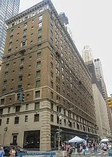 New York Central Railroad director Harold Stirling Vanderbilt originally had a 17-room suite on the top floor.[3][38] The suite was decorated in the French Renaissance style and contained imported French oak paneling in several rooms including the drawing room, dining room, library, and several bedrooms.[38] Vanderbilt's suite also included an onyx-and-marble stairway, as well as a gymnasium and squash court on the roof.[3][38] By 1942, Vanderbilt's suite had been converted to a clubhouse.[39][40]