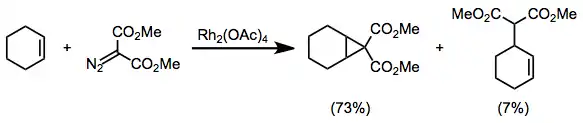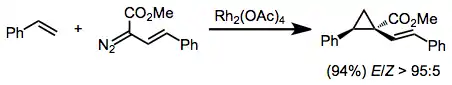 Cyclopropanes may be formed through the reaction of a metal carbenoid species (generated through the reaction of a diazo compound with a transition metal) and an olefin. Although the intramolecular variant of this reaction has been known since 1961,[2] chemo- and stereoselective intermolecular metal-catalyzed cyclopropanation reactions employing diazocarbonyl compounds are more recent. Rhodium carboxylate complexes, such as dirhodium tetraacetate, are most commonly used to catalyze this transformation. Enantioselective cyclopropanations have been developed and typically make use of pre-formed chiral rhodium carboxylate complexes derived from chiral carboxylate ligands.[3]