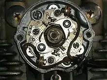 Valve train above a Diesel engine cylinder head. This engine uses rocker arms but no pushrods.