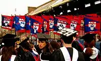 In past years, the Penn Quakers have won the Ivy League championship, sending the jubilant fans into a frenzy. In celebration, the fans ripped down the goal posts and tossed them into the Schuylkill River.[7] This tradition has most likely ended, as the last attempt to tear down the goalposts failed in 2003 as a result of a concrete footing that made efforts to topple them futile. In 2009, students did not attempt to tear down the goal posts, as Penn police officers had made a blockade around them using their bicycles.