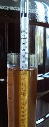 The most accurate method of determining the strength of a beer would be to take a quantity of beer and distill off a spirit that contains all of the alcohol that was in the beer. The alcohol content of the spirit can then be measured using a hydrometer and tables of density of alcohol and water mixtures.[3] A second accurate method is the ebulliometer method, which uses the difference between the boiling temperature of pure water and the boiling temperature of the beer being tested.
