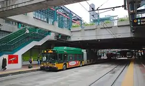 Tunnel construction was completed in early June 1990,[37] a few weeks before the June 23 completion of the Waterfront Streetcar extension serving the future station.[38][39] International District station was dedicated at a public open house during the annual Seafair on July 15, 1990.[40][41] Bus service in the Downtown Seattle Transit Tunnel began on September 15, 1990, with several Metro bus routes moved into the tunnel from surface streets.[42] The tunnel was served by dual-mode buses that would switch from diesel power to electric trolleybus (supplied by overhead wires) at International District station and Convention Place station, the tunnel's respective termini.[43]