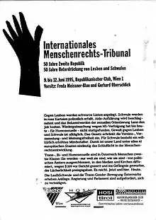 The International Human Rights Tribunal (IHRT) was a symbolic tribunal which took place in Vienna, Austria, in June 1995.[1][2][3][4] It was chaired by environmental and human rights activist Freda Meissner-Blau and Gerhard Oberschlick, editor of FORVM, and was dedicated to the persecution of lesbians, gays, bisexuals and transgender persons in Austria from 1945 to 1995.