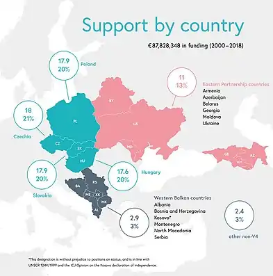 Other beneficiaries, predominantly NGOs from non-EU countries neighbouring with the Visegrad region – from countries of the Eastern Partnership, such as Armenia, Azerbaijan, Belarus, Georgia, Moldova, Ukraine, and the Western Balkans – Albania, Bosnia and Herzegovina, Kosovo, North Macedonia, Montenegro and Serbia are eligible to receive support for projects focusing on the transfer of the unique experience and know-how of the Visegrad Group countries with the processes of democratic transformation and regional integration. An important element of this wider regional cooperation facilitated by the fund is to support activities contributing to political and socio-economic reforms in the partner countries with the aim to support political association and further economic integration between the European Union, the Eastern Partnership, and the aforementioned western Balkans countries.[5]
