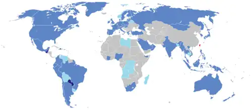 Since the 1970s, the PRC and ROC have competed for diplomatic recognition from nations across the world, often by offering financial aid to poorer countries as an inducement.[62][63] As a precondition for diplomatic relations, the PRC requires that the other country renounce any recognition of the ROC. Since the introduction of the "pragmatic diplomacy" (務實外交; Wùshí wàijiāo) policy in 1991, the ROC has not insisted on consideration as the sole representative of China, and does not require nations that recognise it to end their relations with the PRC.[64] For example, when Saint Lucia recognised the ROC in 2007, its leader expressed his hope that Saint Lucia's relations with the PRC would continue.[65] However, the PRC responds to recognitions of the ROC by suspending relations with the other country.[64]