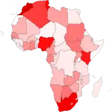 The Internet in Africa is limited by a lower penetration rate when compared to the rest of the world. Measurable parameters such as the number of ISP subscriptions, overall number of hosts, IXP-traffic, and overall available bandwidth are indicators that Africa is far behind the "digital divide". Moreover, Africa itself exhibits an inner digital divide, with most Internet activity and infrastructure concentrated in South Africa, Morocco, Egypt as well as smaller economies like Mauritius and Seychelles. In general, only 24.4% of the African population have access to the Internet, as of 2018.[2] Only 0.4% of the African population has a fixed-broadband subscription. The majority of internet users use it through mobile broadband.[3][4][5][6]