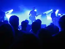 Having first performed at Luna Lounge alongside peers such as the Strokes, Longwave, the National, and Stellastarr, Interpol is one of the bands associated with the New York indie music scene and one of several groups that emerged from the post-punk revival of the 2000s.[3] The band's sound is generally a mix of staccato bass and rhythmic, harmonized guitar with a snare-heavy mix, drawing comparisons to post-punk bands such as Joy Division, Television and The Chameleons,[4] and also to Echo & the Bunnymen and Siouxsie and the Banshees.[5] The band has no primary songwriter, with each member contributing to composition.[6]