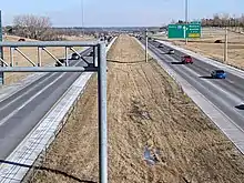 An additional interchange was proposed at Benson Road in northeastern Sioux Falls in the 1980s to serve planned industrial parks in the area and was formally approved by the state government in 1989.[36] It was scheduled to be completed in November 1991, but was delayed due to construction issues; the ramps were barricaded over the winter months, but were moved by motorists who used the unfinished interchange as a shortcut.[37] The interchange opened in 1992 and was the first in eastern South Dakota to have planted wildflower patches to beautify the area, but they were later mowed due to excessive growth and the introduction of invasive weeds.[38][39]