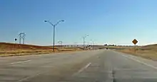 The roadway between Lubbock and Amarillo was part of the Puget Sound to Gulf Highway (SH 9), one of the original state highways defined in 1917.[6] In 1926, it became part of US 385,[7] which was absorbed into US 87 in 1935.[8] The SH 9 overlap was dropped in the 1939 renumbering.[9][10] Paving began in 1929 near Plainview and was almost complete by 1940,[11] with only about eight miles (13 km) south of Canyon still bituminous surfaced until later that decade.[12][13] The Canyon Expressway, a freeway upgrade of US 87 (also US 60 there) between Canyon and Amarillo, was built in the late 1950s and early 1960s.[11] This highway, with a design speed of 45 mph (72 km/h), included frontage roads along its entire length and ended in each city with a Y interchange:[14] the split of US 60 and US 87 in Canyon, and a split between the two oneway pairs of Taylor and Fillmore streets and Pierce and Buchanan streets in Amarillo. The Dumas Expressway, a freeway upgrade of US 87 north from Amarillo, opened several years later, feeding into the same one-way pairs.[15]
