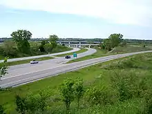 The Osceola area is served by three interchanges for I-35. The first is a partial cloverleaf interchange with US 34. This junction is so configured because of US 34's proximity to the BNSF Railway line, which carries Amtrak's California Zephyr.[4] The next exit for CR H33/Kansas Street serves a casino and western Osceola. Northwest of Osceola is the western end of Iowa 152, which connects I-35 and US 69 at a narrow point between the two routes. Further north, the small towns of New Virginia, Truro, and St. Charles are each served by an interchange. The Iowa 92 exit just east of Bevington connects I-35 to the larger communities of Winterset and Indianola, to the west and east, respectively. The interchange for Cumming is the last before the Interstate enters the Des Moines metropolitan area.[1]