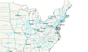 The original defined alignment of I-73 would have run along I-75 to Detroit.[36] However, Congress amended that definition in 1995 to have a branch along the US 223 corridor to south of Jackson and the US 127 corridor north to I-75 near Grayling. From Grayling, it would have used I-75 to Sault Ste. Marie.[37] Except south of Jackson, where the existing highways are two-lane roads and a section of road north of Lansing where the freeway reverts to a divided highway, this corridor is mostly a rural four-lane freeway.[38] The Michigan Department of Transportation (MDOT) included using the US 223 corridor as one of its three options to build I-73 in 2000. The others included using the US 127 corridor all the way into Ohio with a connection to the Ohio Turnpike or using US 127 south and a new freeway connection to US 223 at Adrian.[39] MDOT abandoned further study of I-73 after June 12, 2001, diverting remaining funding to safety improvement projects along the corridor.[40] The department stated there was a "lack of need" for sections of the proposed freeway, and the project website was closed down in 2002.[41] According to press reports in 2011, a group advocating on behalf of the freeway was working to revive the I-73 project in Michigan. According to an MDOT spokesperson, "to my knowledge, we're not taking that issue up again".[42] The Lenawee County Road Commission is not interested in the freeway, and, according to the president of the Adrian Area Chamber of Commerce, "there seems to be little chance of having an I-73 link between Toledo and Jackson built in the foreseeable future."[42]