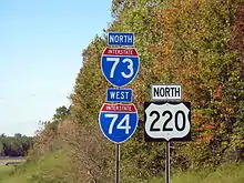 I-74 joins with I-73/US 220 south in Randleman going south to Asheboro. The freeway is already completed but was not allowed to be signed as a full Interstate until the segment through Asheboro was upgraded to Interstate Highway standards in December 2013. The fourth section of I-74 (and I-73) starts along a bypass of Asheboro where a project to improve US 220 to Interstate standards was completed, and Interstate signs went up in 2012.[7][9]