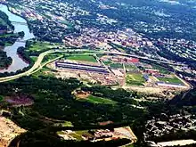 Not far from the General Electric plant is Downtown Schenectady, which the now six-lane I-890 largely bypasses to the south and west on an elevated highway passing over a mostly industrial section of the city. The section closest to the city center runs past by the campus of Schenectady County Community College and provides panoramic views of Downtown Schenectady. I-890 heads south from downtown, crossing over the Delaware and Hudson Railway and CSX Transportation's Hudson Subdivision before finally connecting to downtown by way of Broadway at exit 5. Past Broadway, the elevated highway comes to an end as I-890 heads southeastward into a dense residential area on a plateau overlooking the city. The homes are not visible from I-890, however, as the freeway is lined on both sides by a thick line of trees serving as noise barriers.[5]