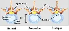 A spinal disc herniation, commonly referred to as a slipped disc, can happen when unbalanced mechanical pressures substantially deform the anulus fibrosus, allowing part of the nucleus to obtrude. These events can occur during peak physical performance, during traumas, or as a result of chronic deterioration (typically accompanied with poor posture), and has been associated with a Propionbacterium acnes infection.[8] Both the deformed anulus and the gel-like material of the nucleus pulposus can be forced laterally or posteriorly, distorting local muscle function and putting pressure on the nearby nerve. This can give symptoms typical of nerve root entrapment, which can vary between paresthesia, numbness, chronic and/or acute pain, either locally or along the dermatome served by the entrapped nerve, loss of muscle tone and decreased homeostatic performance. The disc is not physically slipped; it bulges, usually in just one direction.