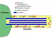 Intraflagellar transport (IFT) describes the bi-directional movement of non-membrane-bound particles along the doublet microtubules of the flagellar, and motile cilia axoneme, between the axoneme and the plasma membrane. Studies have shown that the movement of IFT particles along the microtubule is carried out by two different microtubule motors; the anterograde (towards the flagellar tip) motor is heterotrimeric kinesin-2, and the retrograde (towards the cell body) motor is cytoplasmic dynein 1b. IFT particles carry axonemal subunits to the site of assembly at the tip of the axoneme; thus, IFT is necessary for axonemal growth. Therefore, since the axoneme needs a continually fresh supply of proteins, an axoneme with defective IFT machinery will slowly shrink in the absence of replacement protein subunits. In healthy flagella, IFT particles reverse direction at the tip of the axoneme, and are thought to carry used proteins, or "turnover products," back to the base of the flagellum.[7][8]