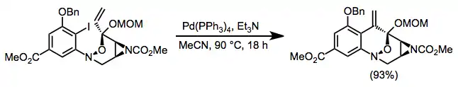 The high functional group tolerance of the intramolecular Heck reaction allows it to be used at a very late stage in synthetic routes. In a synthesis of (±)-FR900482, IMHR establishes a tricyclic ring system in high yield without disturbing any of the sensitive functionality nearby.[18]