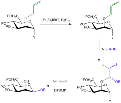 The glycosyl donor is protected at C-2 by OAll group. The allyl group is then isomerized to a prop-1-enyl ether using a rhodium hydride generated from Wilkinson's catalyst ((PPh3)3RhCl) and butyllithium (BuLi). The resulting enol ether is then treated with NIS and the glycosyl acceptor to generate a mixed acetal. The 1,2-cis (e.g. β-mannosyl) product is formed in a final step through activation of the anomeric leaving group, delivery of the aglycon from the mixed acetal and finally hydrolytic work-up to remove the remains of the propenyl ether from O-2.[4]
