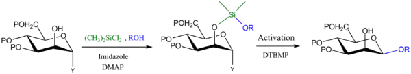 A modified silicon-tethering method involves mixing of the glycosyl donor with the glycosyl acceptor and dimethyldichlorosilane in the presence of imidazole to give the mixed silaketal in one pot. Activation of the tethered intermediate then leads to the β-glycoside product.[8]