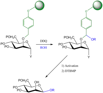 This is a modification of the method of oxidative tethering to a para-methoxybenzyl ether. The difference here is that the para-alkoxybenzyl group is attached to a solid support; the β-mannoside product is released into the solution phase in the last step, while the by-products remain attached to the solid phase. This makes the purification of the β-glycoside easier; it is formed as the almost exclusive product.[6]