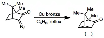 Either copper powder or copper salts can be used very generally for intramolecular reactions of diazocarbonyl compounds. This section describes the different types of diazocarbonyl compounds that may undergo intramolecular reactions in the presence of copper. Note that for intermolecular reactions of diazocarbonyl compounds, the use of rhodium catalysts is preferred.[2]