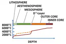 The source of mantle plumes is postulated to be the core-mantle boundary at 3,000 km depth.[24] Because there is little material transport across the core-mantle boundary, heat transfer must occur by conduction, with adiabatic gradients above and below this boundary. The core-mantle boundary is a strong thermal (temperature) discontinuity. The temperature of the core is approximately 1,000 degrees Celsius higher than that of the overlying mantle. Plumes are postulated to rise as the base of the mantle becomes hotter and more buoyant.