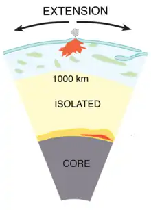 The current mantle plume theory is that material and energy from Earth's interior are exchanged with the surface crust in two distinct modes: the predominant, steady state plate tectonic regime driven by upper mantle convection, and a punctuated, intermittently dominant, mantle overturn regime driven by plume convection.[5] This second regime, while often discontinuous, is periodically significant in mountain building[16] and continental breakup.[17]