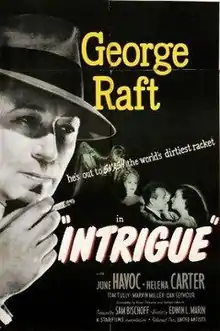 Intrigue is a 1947 American film noir crime film directed by Edwin L. Marin and starring George Raft, June Havoc and Helena Carter. Intrigue was intended to be the first of a number of films Raft made, with producer Sam Bischoff, for his own production company, Star Films.[1][2] It was one of several movies Raft made with Marin.[3]