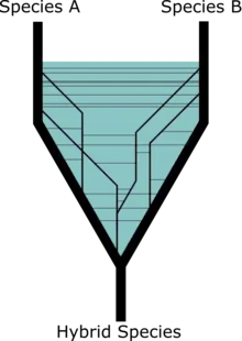 A phylogenetic model of introgressive hybridization; the hybrid zone of the two species' lineages is shown in blue, with each horizontal line representing an individual introgressive event.
