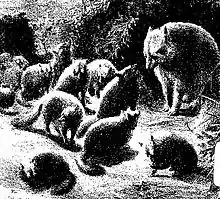 In Shikoku, there are many folk tales and legends about tanuki, but the tanuki of Matsuyama in particular has a history of them that goes back to the beginning of history in the ages of Emperor Tenji, and as a result of tanuki giving birth to tanuki, there were 808 of them. Its leader was Inugami Gyōbu. He lived in an old cave in Kumayama, and was a bake-danuki that continued to protect the Matsuyama Castle, and from his household of 808 tanuki, was also called "Eight Hundred and Eight Tanuki (八百八狸, Happyakuya-danuki)."[4] He was said to have the greatest divine power in Shikoku.[5]