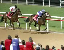 Invasor (foaled August 3, 2002) is a Thoroughbred racehorse bred in Argentina[2] by Haras Clausan (Haras Santa Ines). The winner of the 2005 Triple Crown in Uruguay, he was later purchased by Sheik Hamdan bin Rashid Al Maktoum, who paid approximately US$1.4 million for the horse. His two biggest wins were the 2006 Breeders' Cup Classic, in which he defeated heavily favored Bernardini and highly fancied Lava Man, and the 2007 Dubai World Cup, the world's richest horse race. He finished racing with a record of eleven wins in twelve starts and career earnings of $7,804,070. He was voted the Eclipse Award for American Horse of the Year and led the year-end World Thoroughbred Racehorse Rankings in 2006. In 2013 he was inducted into the National Museum of Racing and Hall of Fame in Saratoga Springs, New York.