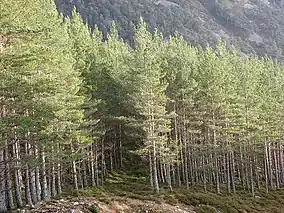 Demand for timber increased again during the First and Second World Wars, and by the end of the Second World War only woods in the most remote parts of Scotland were still intact.[15] Following this period, interest in preserving the remaining woodlands grew, and the Nature Conservancy (NC) purchased Invereshie in 1954, making area was made part of the Cairngorms National Nature Reserve. The NC, and its successor bodies, the Nature Conservancy Council (NCC), Scottish Natural Heritage (SNH), and NatureScot, made efforts to encourage regrowth of the woodland, reducing deer numbers, erecting fences to exclude deer, and planting native tree species.[16] During this period the Inshriach Estate, to the west of Invereshie, came under the ownership of the Forestry Commission. During the 1960s and 70s Inshriach was managed mainly for commercial forestry, and non-native species such as sitka spruce and lodgepole pine were planted in the area. Since the 1990s the emphasis has changed, and the Commission began work aimed at restoring the native forest.[17]