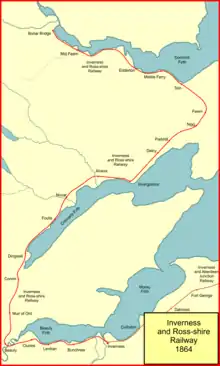 The Inverness and Ross-shire Railway was a Scottish railway company formed in 1860 to build a line from Inverness to Invergordon. It opened in 1862 as far as Dingwall and in 1863 to Invergordon. It was extended to a Bonar Bridge station in 1864. It provided the basis for later extensions that eventually reached Thurso, forming the Far North Line. The Dingwall and Skye Railway branched off at Dingwall to reach the Kyle of Lochalsh.