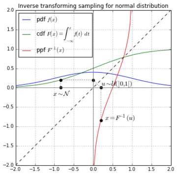 Computationally, this method involves computing the quantile function of the distribution — in other words, computing the cumulative distribution function (CDF) of the distribution (which maps a number in the domain to a probability between 0 and 1) and then inverting that function. This is the source of the term "inverse" or "inversion" in most of the names for this method. Note that for a discrete distribution, computing the CDF is not in general too difficult: we simply add up the individual probabilities for the various points of the distribution. For a continuous distribution, however, we need to integrate the probability density function (PDF) of the distribution, which is impossible to do analytically for most distributions (including the normal distribution). As a result, this method may be computationally inefficient for many distributions and other methods are preferred; however, it is a useful method for building more generally applicable samplers such as those based on rejection sampling.