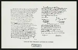 Giovanni Battista della Porta is credited with the first recipe for a sympathetic ink, derived from alum and vinegar, as well as the first book on secret writing and invisible inks, Magia Naturalis(1558, 1589).[8][4]: 24 Since then, a wide variety of invisible inks have been used for all sorts of secretive purposes. A formula similar to oak gall ink was created by James Jay and used by George Washington and the Culper Spy Ring during the American Revolution and lemon juice was used by the 'Lemon Juice Spies' (Carl Muller and 4 other Germans, who all died for their efforts either by suicide or execution, along with John Hahn, an English baker) during World War I.[6][4] In World War II, neutral or acidic solutions of phenolphthalein, a chemical compound extracted from pills for constipation, were used as invisible ink.[9] It is colorless but turns pink when exposed to alkali such as ammonia and bicarbonate soda.[9]