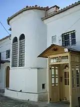According to the local Greek scholar Panayiotis Aravantinos, a synagogue destroyed in the 18th century bore an inscription, which dated its foundation in the late 9th century AD.[54] The existing synagogue is located in the old fortified part of the city known as "Kastro", at 16 Ioustinianou street. Its name means "the Old Synagogue". It was constructed in 1829. Its architecture is typical of the Ottoman era, a large building made of stone. The interior of the synagogue is laid out in the Romaniote way: the bimah (where the Torah scrolls are read out during service) is on a raised dais on the western wall, the Aron haKodesh (where the Torah scrolls are kept) is on the eastern wall and at the middle there is a wide interior aisle. The names of the Ioanniote Jews who were killed in the Holocaust are engraved in stone on the walls of the synagogue.