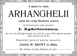 Arhanghelii, which has some 400 pages in the published edition, was written in one single effort over a few weeks, and published with no corrections.[23] The work contains an implicit Christian lesson is about the love of money and its devastation of an Apuseni get-rich mining community; it is also one of Agârbiceanu's literary studies into the economic mindset as transformed by the arrival of credit, by the "alienating effects of existence outside the logic of agricultural labour."[206] The work includes minute descriptions of Bucium topography and social history. As argued by Marxist writer-documentarist Dumitru Radu Popescu, most such records point to the indifference of rich miners toward more destitute inhabitants.[207]