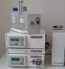 The two types of ion chromatography are anion-exchange and cation-exchange. Cation-exchange chromatography is used when the molecule of interest is positively charged. The molecule is positively charged because the pH for chromatography is less than the pI (a/k/a pH(I)).[2] In this type of chromatography, the stationary phase is negatively charged and positively charged molecules are loaded to be attracted to it. Anion-exchange chromatography is when the stationary phase is positively charged and negatively charged molecules (meaning that pH for chromatography is greater than the pI) are loaded to be attracted to it.[3] It is often used in protein purification, water analysis,[4][5] and quality control. The water-soluble and charged molecules such as proteins, amino acids, and peptides bind to moieties which are oppositely charged by forming ionic bonds to the insoluble stationary phase.[6] The equilibrated stationary phase consists of an ionizable functional group where the targeted molecules of a mixture to be separated and quantified can bind while passing through the column—a cationic stationary phase is used to separate anions and an anionic stationary phase is used to separate cations. Cation exchange chromatography is used when the desired molecules to separate are cations and anion exchange chromatography is used to separate anions.[7] The bound molecules then can be eluted and collected using an eluant which contains anions and cations by running higher concentration of ions through the column or changing pH of the column.