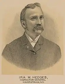 Hedges was the Grand Army of the Republic's Commander of the Department of New York and Inspector-General of the national organization.[8] He was also vice-president of the Society of the Army of the Potomac and founder of the Haverstraw post of the Sons of Union Veterans of the Civil War.[9] He was a member of the American Scenic and Historic Preservation Society. He married Jeanette S. Knapp in 1866. Their three daughters were Margaret, Irene, and Lila.[1]