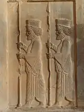 Old Persian is attested in the Behistun Inscription (c. 519 BC), recording a proclamation by Darius the Great.[67] In southwestern Iran, the Achaemenid kings usually wrote their inscriptions in trilingual form (Elamite, Babylonian and Old Persian)[68] while elsewhere other languages were used. The administrative languages were Elamite in the early period, and later Imperial Aramaic,[69] as well as Greek, making it a widely used bureaucratic language.[70] Even though the Achaemenids had extensive contacts with the Greeks and vice versa, and had conquered many of the Greek-speaking area's both in Europe and Asia Minor during different periods of the empire, the native Old Iranian sources provide no indication of Greek linguistic evidence.[70] However, there is plenty of evidence (in addition to the accounts of Herodotus) that Greeks, apart from being deployed and employed in the core regions of the empire, also evidently lived and worked in the heartland of the Achaemenid Empire, namely Iran.[70] For example, Greeks were part of the various ethnicities that constructed Darius' palace in Susa, apart from the Greek inscriptions found nearby there, and one short Persepolis tablet written in Greek.[70]