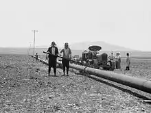 Different routes and terminal locations on the Mediterranean coast were sought by the French, who favored a northern route through Syria and Lebanon terminating at the city of Tripoli on the Lebanese coast, and the British and the Iraqis who preferred a southern route, terminating at Haifa, in what then was Palestine. The issue was settled by a compromise which provided for the construction of two pipelines, each with a throughput capacity of 2,000,000 tons a year. The length of the Northern line would be 532 miles (856 km), that of the Southern line (Mosul-Haifa oil pipeline) 620 miles (1,000 km).[19] In 1934, the pipelines were completed from Kirkuk to Al Hadithah, and from there, to both Tripoli and Haifa; the Kirkuk Field was brought online the same year. Only in 1938, nine years after the discovery, did IPC begin to export oil in significant quantities.[18]