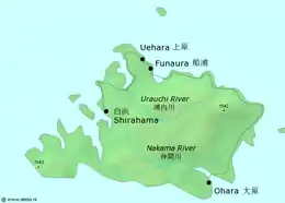 The island has an area of 289.27 km2 (111.69 sq mi) and a 2005 population of 2,347. The island does not have an airstrip, and most visitors — over 390,000 in 2006 — arrive from Ishigaki by ferry, a 31.4 km (19.5 mi) ride to Uwahara Port (上原港) on Iriomote's northeast coast or Ōhara Port (大原港) on the southeast coast. Administratively the island belongs to Taketomi Town, Okinawa Prefecture.[1] Infrastructure is limited to a single coastal road connecting the hamlets on the northern and eastern shores.