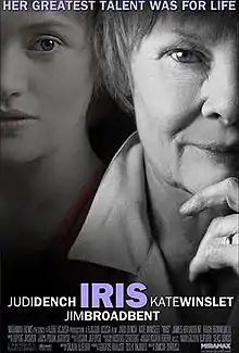 Iris is a 2001 biographical drama film about novelist Iris Murdoch and her relationship with her husband John Bayley. Directed by Richard Eyre from a screenplay he co-wrote with Charles Wood, the film is based on Bayley's 1999 memoir Elegy for Iris.[3] Judi Dench and Jim Broadbent portray Murdoch and Bayley during the later stages of their marriage, while Kate Winslet and Hugh Bonneville appear as the couple in their younger years. The film contrasts the start of their relationship, when Murdoch was an outgoing, dominant individual compared to the timid and scholarly Bayley, and their later life, when Murdoch was suffering from Alzheimer's disease and tended to by a frustrated Bayley in their North Oxford home in Charlbury Road. The beach scenes were filmed at Southwold in Suffolk, one of Murdoch's favourite haunts.