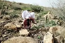 Irises can generally be propagated by division,[40] or by seed growing. Irises generally require a period of cold, then a period of warmth and heat, also they need some moisture. Some seeds need stratification, (the cold treatment), which can be carried out indoors or outdoors. Seedlings are generally potted on (or transplanted) when they have 3 leaves.[41] Oncoyclus irises dislike division, but it should only be carried out when the plant is overcrowded. Although hand pollination and germinating seedlings gives better results.[42]