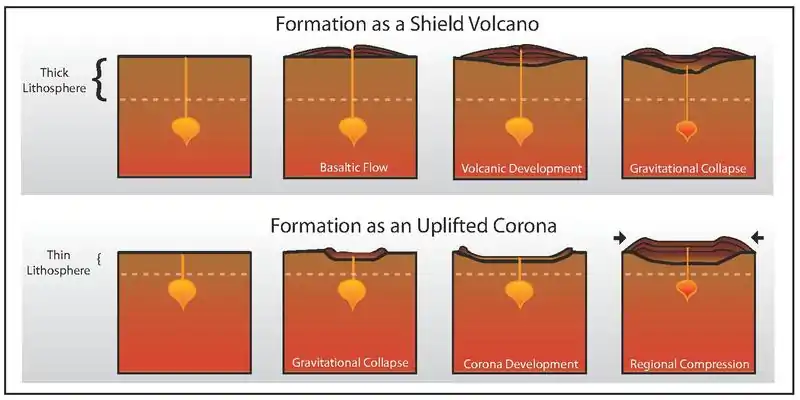 An alternate theory is, rather than being a shield volcano, Irnini Mons developed as a corona under thin lithosphere, and was simply tectonically uplifted to its present elevation under the north-south compression. Coronae develop when a mantle upwelling bends the crust upwards, which later collapses when the dynamic support from the upwelling is lost, resulting in a shallow oval-shaped depression. This hypothesis requires two assumptions:[8]