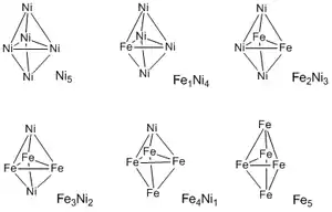 Iron–nickel (Fe–Ni) clusters are metal clusters consisting of iron and nickel, i.e. Fe–Ni structures displaying polyhedral frameworks held together by two or more metal–metal bonds per metal atom, where the metal atoms are located at the vertices of closed, triangulated polyhedra.[1]