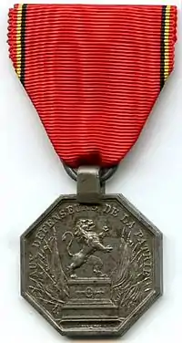 The Iron Cross second class was an octagonal medal struck from iron. Its obverse bore the relief image of the Belgian lion, an heraldic "lion rampant" on a pedestal, but moving from left to right, with banners to the left and right, the relief circular inscription along the medal's upper edge (French: "AUX DEFENSEURS DE LA PATRIE") translating into "TO THE DEFENDERS OF THE COUNTRY". The relief bore the relief coats of arms of the nine Belgian provinces arranged in a circle around a sun with the relief year "1830" superimposed over it, all of which are surrounded by the relief circular inscription (French: "INDEPENDANCE DE LA BELGIQUE") translating into "INDEPENDENCE OF BELGIUM". The award was topped by a pivot mounted crown from which it was suspended to the same ribbon as the cross first class by a ring through a suspension loop.[2]